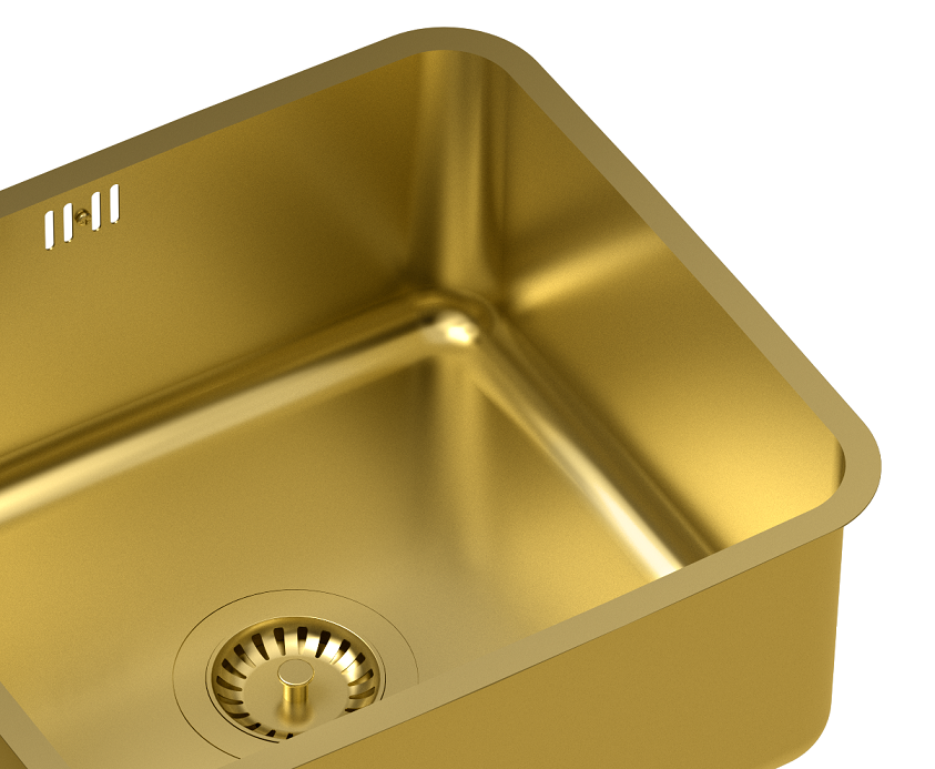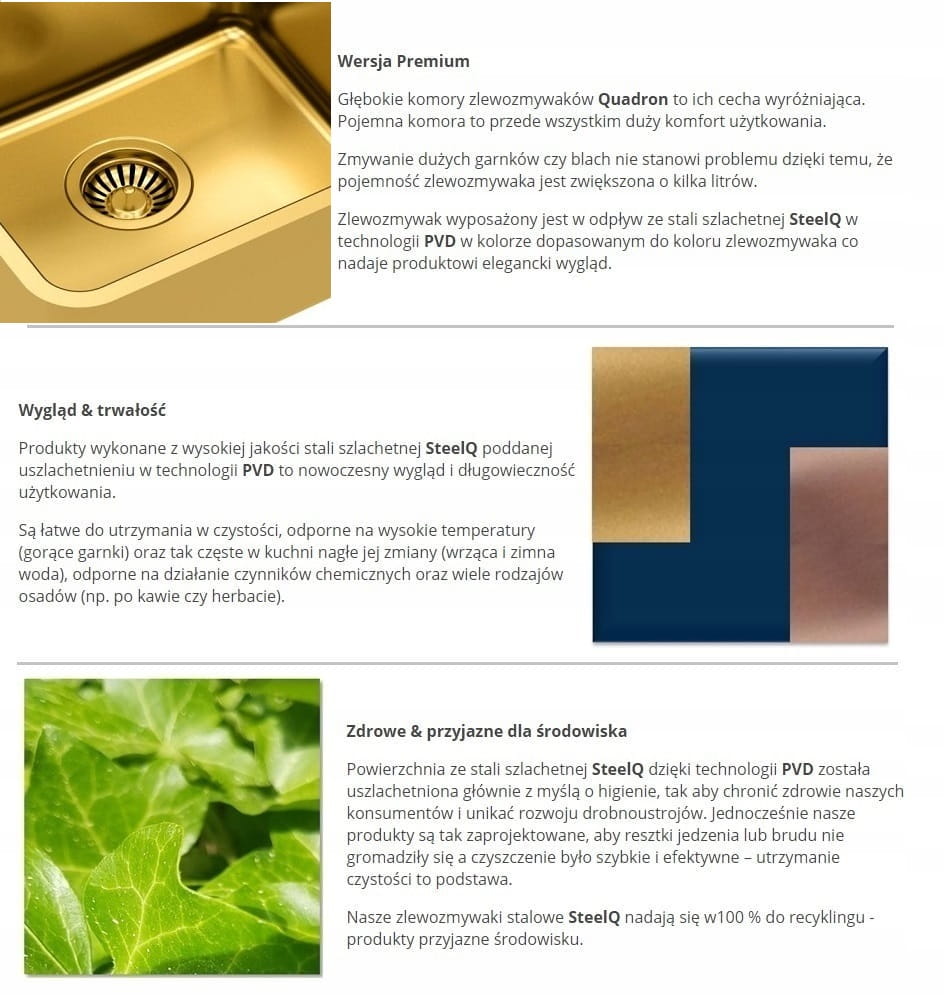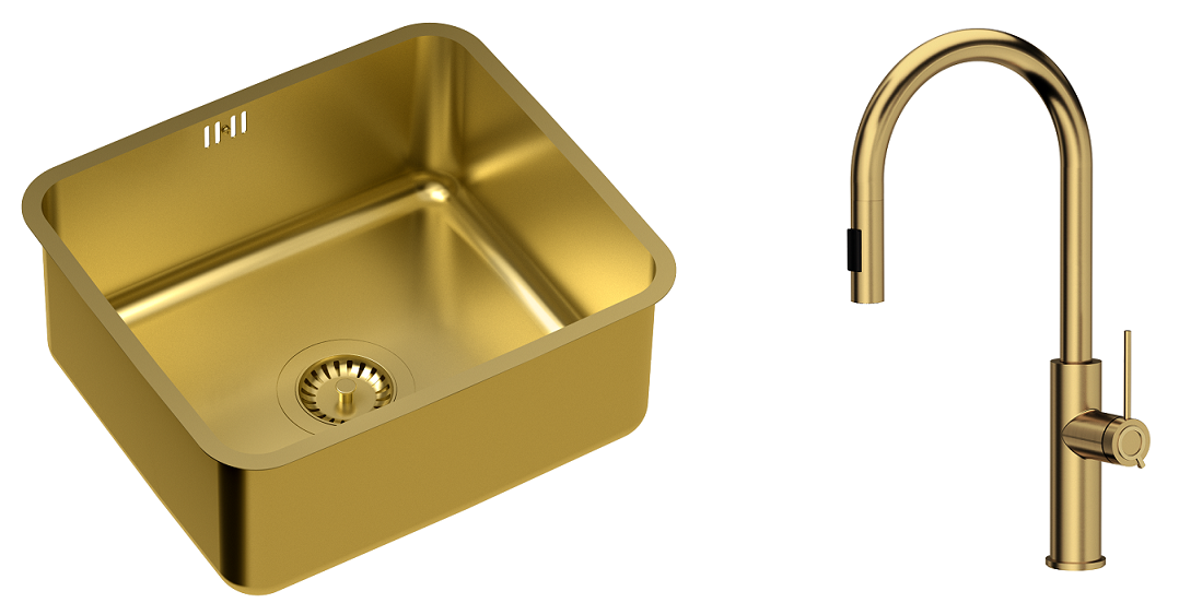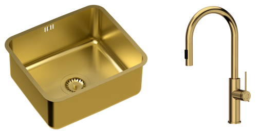 Zestaw zawiera zlewozmywak stalowy NICOLAS ZŁOTY + bateria kuchenna JENNIFER Q LINE SLIM z wyciąganą wylewką i funkcją prysznica + syfon save space z odpływem 3,5"