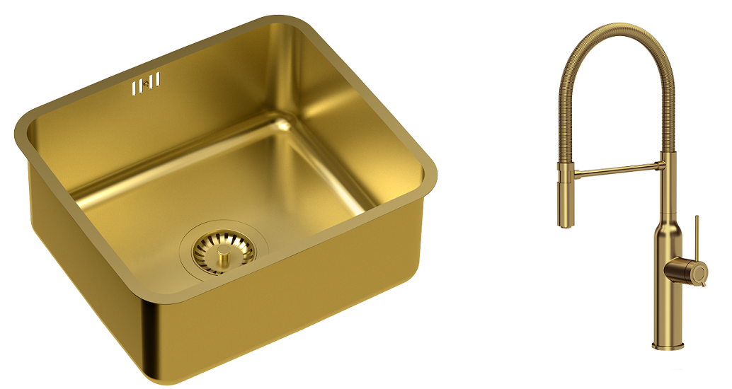 Zestaw zawiera zlewozmywak stalowy NICOLAS ZŁOTY + bateria kuchenna MARILYN Q LINE z ruchomą wylewką + syfon save space z odpływem 3,5"