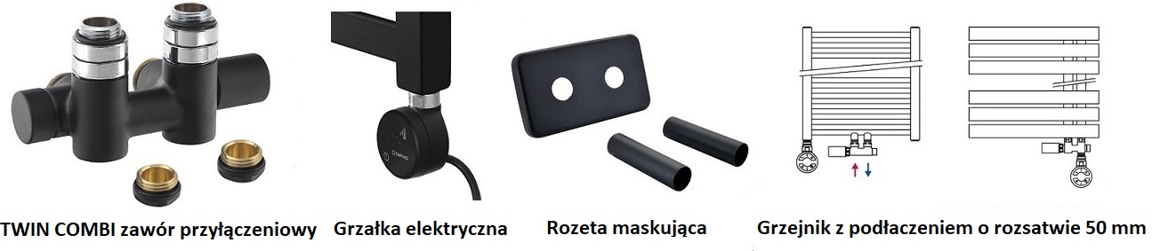 W przypadku gdy grzejnik jest ogrzewany wyłącznie elektrycznie, tzn. za pomocą grzałki, należy dodatkowo dokupić zaślepkę ½" , aby zatkać drugi otwór w grzejniku, który w przeciwnym razie zostałby wykorzystany do podłączenia do centralnego ogrzewania.
