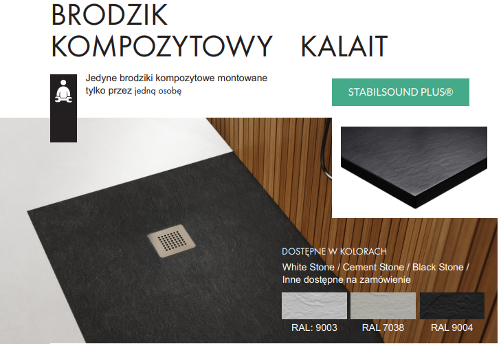 KALAIT BLACK STONE to nowoczesne brodziki wzorowane na ponadczasowej geometrii, których znakiem rozpoznawczym jest niesamowicie intrygująca w dotyku struktura przypominająca do złudzenia kamień. Kamień kojarzy się z wytrzymałością, elegancją i ponadczasowością sam w sobie z natury jest ciężki i zimny, ale dzięki nowoczesnej technologii marki SCHEDPOL mamy do czynienia z kamieniem w innym wydaniu :) A konkretnie materiał z którego wykonany jest brodzik KALAIT jest wytrzymały jak kamień, jego struktura przypomina kamień, ale konstrukcja jest stosunkowo lekka i co ważne brodzik doskonale przewodzi ciepło, dzięki czemu kontakt ze skórą stóp jest przyjemny :)   Brak klasycznych rantów przekłada się na niezwykle przestrzenną i czystą formę strefy kąpielowej, a odpowiednie spady konstrukcyjne zapewniają sprawny odpływ wody. Brodziki dają możliwość montażu „wpuszczanego”, dzięki czemu eliminują próg na wejściu do strefy prysznicowej. Seria KALAIT BLACK STONE tak jak zaznaczone było wcześniej, posiada matową powierzchnię o strukturze, naturalnego kamienia w kolorze pięknej wręcz mrocznej czerni odcień - RAL 9004. Czarny jest to kolor, który zawsze ciekawi i ma w sobie coś takiego, że przyciąga uwagę. Kolor ten stał się bardzo chętnie wybieranym kolorem w aranżacjach, a sanitariaty w tym odcieniu to ciekawy akcent, który zmienia cały wystrój i wprowadza niepowtarzalny klimat :) Zaledwie 3,5 cm wysokości całkowitej oraz minimalistyczne wzornictwo efektownie akcentują strefę prysznica, zdobiąc wnętrze w nietuzinkowy sposób. Powierzchnia „BLACK Stone” jest niezwykle trwała, do tego posiada właściwości Easy to Clean® oraz Antibac®. Płytkość brodzików sprawia, iż pasują one doskonale do nowoczesnych wnętrz. Projektanci tworząc tą prezentowaną serię brodzików kierowali się ekskluzywnym designem połączonym z łatwością montażu i pełnym zadowoleniem użytkownika :) Prezentowana linia  z niesamowicie odporną na zanieczyszczenia maskownicą wykonaną ze stali nierdzewnej to model reprezentujący grupę brodzików, które będą doskonałym wyborem do każdego typu łazienki :) Brodziki o strukturze kamienia doskonale zaprezentują się w klasycznej aranżacji, a w nowoczesnym salonie kąpielowym będą dosłownie "kropeczką nad literką i". Tak nietuzinkowe brodziki  zostały stworzone dla ludzi, którzy stawiają na jakość, i ekstrawagancję, nie bojąc się odważnych aranżacji i rewolucyjnych rozwiązań :) Designerskie brodziki KALAIT BLACK STONE wykonano z wysokogatunkowego wielowarstwowego kompozytu Stonicryl® wzmacniającego konstrukcyjnie dno i ranty brodzika, z matowym efektem mineralnym (kamienista struktura powierzchni). Co istotne - brodziki są bezpieczne dla zdrowia i środowiska, tj. wolne od FCKW, czyli nie zawierają freonów, które niszczą warstwę ozonową, a tym samym przyczyniają się do globalnego ocieplenia klimatu. Brodziki z podbudową STABILSOUND PLUS® wyróżnia nie tylko zintegrowana forma, ale również wysoka wytrzymałość brodzika na nacisk i na uszkodzenia mechaniczne :) Zastosowane technologie doskonale zabezpieczają powierzchnię przed uszkodzeniami mechanicznymi oraz mają zastosowanie wygłuszające i termoizolacyjne. Wysokiej jakości kompozyt jest bardzo trwały oraz doskonale przewodzi ciepło, co sprawia dodatkowe poczucie przyjemności podczas kąpieli pod prysznicem, gdyż powierzchnia brodzika jest ciepła co sprawia, że kontakt skóry stóp z powierzchnią brodzika jest naturalnym doznaniem :) Warto podkreślić, że ciekawa struktura kamienia sprawia, że powierzchnia nie będzie śliska  co sprawi większe poczucie bezpieczeństwa :) Kolejnym walorem brodzików KALAIT jest szybki i prosty montaż, który może wykonać samodzielnie jedna osoba.  Brodzik można zamontować bezprogowo (rozwiązanie to docenią wszyscy użytkownicy, a szczególnie seniorzy lub osoby z ograniczeniami ruchowymi). Powierzchnia o czarnej kamienistej strukturze (RAL 9004; klasa antypoślizgowa „A” zgodnie z DIN 51097) zapewnia komfort użytkowania i zmniejsza ryzyko upadków spowodowanych poślizgnięciem.  Seria ta idealnie wpasuje się do każdej przestrzeni łazienkowej ponieważ istnieje możliwość docięcia brodzika do odpowiedniego wymiaru. Warto pokusić się na produkt, który jest efektowny wizualnie i komfortowy w użytkowaniu :) Takim produktem jest właśnie linia KALAIT BLACK STONE  będącą częścią marki SCHEDPOL  :)