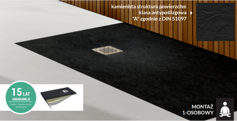 KALAIT BLACK STONE to nowoczesne brodziki wzorowane na ponadczasowej geometrii, których znakiem rozpoznawczym jest niesamowicie intrygująca w dotyku struktura przypominająca do złudzenia kamień. Kamień kojarzy się z wytrzymałością, elegancją i ponadczasowością sam w sobie z natury jest ciężki i zimny, ale dzięki nowoczesnej technologii marki SCHEDPOL mamy do czynienia z kamieniem w innym wydaniu :) A konkretnie materiał z którego wykonany jest brodzik KALAIT jest wytrzymały jak kamień, jego struktura przypomina kamień, ale konstrukcja jest stosunkowo lekka i co ważne brodzik doskonale przewodzi ciepło, dzięki czemu kontakt ze skórą stóp jest przyjemny :) Brak klasycznych rantów przekłada się na niezwykle przestrzenną i czystą formę strefy kąpielowej, a odpowiednie spady konstrukcyjne zapewniają sprawny odpływ wody. Brodziki dają możliwość montażu „wpuszczanego”, dzięki czemu eliminują próg na wejściu do strefy prysznicowej. Seria KALAIT BLACK STONE tak jak zaznaczone było wcześniej, posiada matową powierzchnię o strukturze, naturalnego kamienia w kolorze pięknej wręcz mrocznej czerni odcień - RAL 9004. Czarny jest to kolor, który zawsze ciekawi i ma w sobie coś takiego, że przyciąga uwagę. Kolor ten stał się bardzo chętnie wybieranym kolorem w aranżacjach, a sanitariaty w tym odcieniu to ciekawy akcent, który zmienia cały wystrój i wprowadza niepowtarzalny klimat :) Zaledwie 4 cm wysokości całkowitej oraz minimalistyczne wzornictwo efektownie akcentują strefę prysznica, zdobiąc wnętrze w nietuzinkowy sposób. Powierzchnia „BLACK Stone” jest niezwykle trwała, do tego posiada właściwości Easy to Clean® oraz Antibac®. Płytkość brodzików sprawia, iż pasują one doskonale do nowoczesnych wnętrz. Projektanci tworząc tą prezentowaną serię brodzików kierowali się ekskluzywnym designem połączonym z łatwością montażu i pełnym zadowoleniem użytkownika :) Prezentowana linia z niesamowicie odporną na zanieczyszczenia maskownicą wykonaną ze stali nierdzewnej to model reprezentujący grupę brodzików, które będą doskonałym wyborem do każdego typu łazienki :) Brodziki o strukturze kamienia doskonale zaprezentują się w klasycznej aranżacji, a w nowoczesnym salonie kąpielowym będą dosłownie "kropeczką nad literką i". Tak nietuzinkowe brodziki zostały stworzone dla ludzi, którzy stawiają na jakość, i ekstrawagancję, nie bojąc się odważnych aranżacji i rewolucyjnych rozwiązań :) Designerskie brodziki KALAIT BLACK STONE wykonano z wysokogatunkowego wielowarstwowego kompozytu Stonicryl® wzmacniającego konstrukcyjnie dno i ranty brodzika, z matowym efektem mineralnym (kamienista struktura powierzchni). Co istotne - brodziki są bezpieczne dla zdrowia i środowiska, tj. wolne od FCKW, czyli nie zawierają freonów, które niszczą warstwę ozonową, a tym samym przyczyniają się do globalnego ocieplenia klimatu. Brodziki z podbudową STABILSOUND PLUS® wyróżnia nie tylko zintegrowana forma, ale również wysoka wytrzymałość brodzika na nacisk i na uszkodzenia mechaniczne :) Zastosowane technologie doskonale zabezpieczają powierzchnię przed uszkodzeniami mechanicznymi oraz mają zastosowanie wygłuszające i termoizolacyjne. Wysokiej jakości kompozyt jest bardzo trwały oraz doskonale przewodzi ciepło, co sprawia dodatkowe poczucie przyjemności podczas kąpieli pod prysznicem, gdyż powierzchnia brodzika jest ciepła co sprawia, że kontakt skóry stóp z powierzchnią brodzika jest naturalnym doznaniem :) Warto podkreślić, że ciekawa struktura kamienia sprawia, że powierzchnia nie będzie śliska co sprawi większe poczucie bezpieczeństwa :) Kolejnym walorem brodzików KALAIT jest szybki i prosty montaż, który może wykonać samodzielnie jedna osoba. Brodzik można zamontować bezprogowo (rozwiązanie to docenią wszyscy użytkownicy, a szczególnie seniorzy lub osoby z ograniczeniami ruchowymi). Powierzchnia o czarnej kamienistej strukturze (RAL 9004; klasa antypoślizgowa „A” zgodnie z DIN 51097) zapewnia komfort użytkowania i zmniejsza ryzyko upadków spowodowanych poślizgnięciem. Seria ta idealnie wpasuje się do każdej przestrzeni łazienkowej ponieważ istnieje możliwość docięcia brodzika do odpowiedniego wymiaru. Warto pokusić się na produkt, który jest efektowny wizualnie i komfortowy w użytkowaniu :) Takim produktem jest właśnie linia KALAIT BLACK STONE będącą częścią marki SCHEDPOL :)