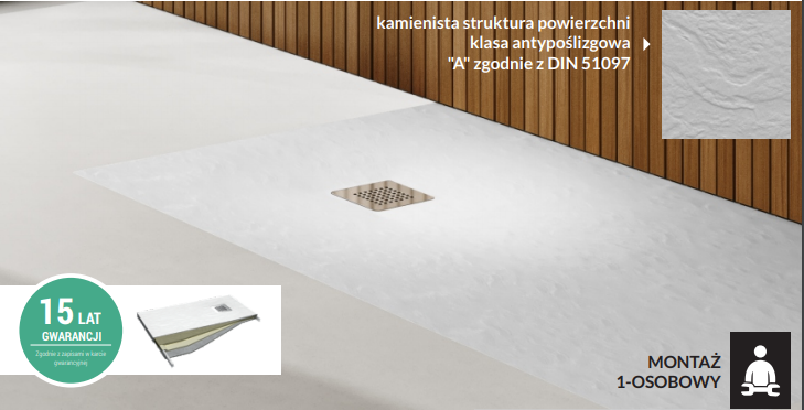 KALAIT WHITE STONE to nowoczesne brodziki wzorowane na ponadczasowej geometrii, których znakiem rozpoznawczym jest niesamowicie intrygująca w dotyku struktura przypominająca do złudzenia kamień. Kamień kojarzy się z wytrzymałością, elegancją i ponadczasowością sam w sobie z natury jest ciężki i zimny, ale dzięki nowoczesnej technologii marki SCHEDPOL mamy do czynienia z kamieniem w innym wydaniu :) A konkretnie materiał z którego wykonany jest brodzik KALAIT jest wytrzymały jak kamień, jego struktura przypomina kamień, ale konstrukcja jest stosunkowo lekka i co ważne brodzik doskonale przewodzi ciepło, dzięki czemu kontakt ze skórą stóp jest przyjemny :) Brak klasycznych rantów przekłada się na niezwykle przestrzenną i czystą formę strefy kąpielowej, a odpowiednie spady konstrukcyjne zapewniają sprawny odpływ wody. Brodziki dają możliwość montażu „wpuszczanego”, dzięki czemu eliminują próg na wejściu do strefy prysznicowej. Seria KALAIT WHITE STONE tak jak zaznaczone było wcześniej, posiada matową powierzchnię o strukturze, naturalnego kamienia w białym kolorze (RAL 9003). Zaledwie 3,5 cm wysokości całkowitej oraz minimalistyczne wzornictwo efektownie akcentują strefę prysznica, zdobiąc wnętrze w nietuzinkowy sposób. Powierzchnia „White Stone” jest niezwykle trwała, do tego posiada właściwości Easy to Clean® oraz Antibac®. Płytkość brodzików sprawia, iż pasują one doskonale do nowoczesnych wnętrz. Projektanci tworząc tą prezentowaną serię brodzików kierowali się ekskluzywnym designem połączonym z łatwością montażu i pełnym zadowoleniem użytkownika :) Prezentowana linia z niesamowicie odporną na zanieczyszczenia maskownicą wykonaną ze stali nierdzewnej to model reprezentujący grupę brodzików, które będą doskonałym wyborem do każdego typu łazienki :) Brodziki o strukturze kamienia doskonale zaprezentują się w klasycznej aranżacji, a w nowoczesnym salonie kąpielowym będą dosłownie "kropeczką nad literką i". Tak nietuzinkowe brodziki zostały stworzone dla ludzi, którzy stawiają na jakość, i ekstrawagancję, nie bojąc się odważnych aranżacji i rewolucyjnych rozwiązań :) Designerskie brodziki KALAIT WHITE STONE wykonano z wysokogatunkowego wielowarstwowego kompozytu Stonicryl® wzmacniającego konstrukcyjnie dno i ranty brodzika, z matowym efektem mineralnym (kamienista struktura powierzchni). Co istotne - brodziki są bezpieczne dla zdrowia i środowiska, tj. wolne od FCKW, czyli nie zawierają freonów, które niszczą warstwę ozonową, a tym samym przyczyniają się do globalnego ocieplenia klimatu. Brodziki z podbudową STABILSOUND PLUS® wyróżnia nie tylko zintegrowana forma, ale również wysoka wytrzymałość brodzika na nacisk i na uszkodzenia mechaniczne :) Zastosowane technologie doskonale zabezpieczają powierzchnię przed uszkodzeniami mechanicznymi oraz mają zastosowanie wygłuszające i termoizolacyjne. ponadczasowy kolor bieli doskonale wkomponuje się w każdą aranżację i sprawi, że łazienka będzie zachwycająca i sterylnie czysta :) Wysokiej jakości kompozyt jest bardzo trwały oraz doskonale przewodzi ciepło, co sprawia dodatkowe poczucie przyjemności podczas kąpieli pod prysznicem, gdyż powierzchnia brodzika jest ciepła co sprawia, że kontakt skóry stóp z powierzchnią brodzika jest naturalnym doznaniem :) Warto podkreślić, że ciekawa struktura kamienia sprawia, że powierzchnia nie będzie śliska co sprawi większe poczucie bezpieczeństwa :) Kolejnym walorem brodzików KALAIT jest szybki i prosty montaż, który może wykonać samodzielnie jedna osoba. Brodzik można zamontować bezprogowo (rozwiązanie to docenią wszyscy użytkownicy, a szczególnie seniorzy lub osoby z ograniczeniami ruchowymi). Powierzchnia o białej kamienistej strukturze (RAL 9003; klasa antypoślizgowa „A” zgodnie z DIN 51097) zapewnia komfort użytkowania i zmniejsza ryzyko upadków spowodowanych poślizgnięciem. Seria ta idealnie wpasuje się do każdej przestrzeni łazienkowej ponieważ istnieje możliwość docięcia brodzika do odpowiedniego wymiaru. Warto pokusić się na produkt, który jest efektowny wizualnie i komfortowy w użytkowaniu :) Takim produktem jest właśnie linia KALAIT WHITE STONE będącą częścią marki SCHEDPOL :)