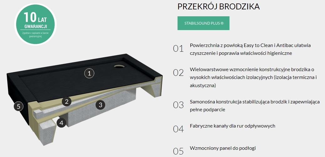 • technologia: STABILSOUND PLUS ® - wielowarstwowe wzmocnienie konstrukcyjne brodzika o wysokich właściwościach izolacyjnych (izolacja termiczna i akustyczna),
