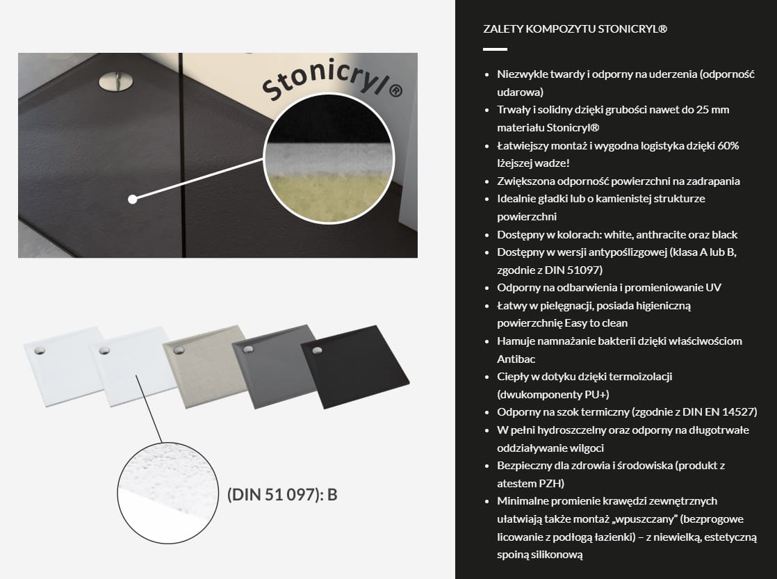 PROTOS SMOOTH WHITE ( biały gładki ) to wyrafinowane brodziki charakteryzujące się nowoczesnym designem podkreślonym niesamowitą w dotyku gładką powierzchnią. Brak klasycznych rantów przekłada się na niezwykle przestrzenną i czystą formę strefy kąpielowej, a odpowiednie spady konstrukcyjne zapewniają sprawny odpływ wody. Brodziki dają możliwość montażu „wpuszczanego”, dzięki czemu eliminują próg na wejściu do strefy prysznicowej. Seria PROTOS SMOOTH WHITE posiada gładką powierzchnię o wysokim połysku w białym kolorze (RAL 9003). Zaledwie 3,5 cm wysokości całkowitej oraz minimalistyczne wzornictwo efektownie akcentują strefę prysznica, zdobiąc wnętrze w nietuzinkowy sposób. Powierzchnia „Smooth White” jest niezwykle trwała, do tego posiada właściwości Easy to Clean® oraz Antibac®. Płytkość brodzików sprawia, iż pasują one doskonale do nowoczesnych wnętrz. Linia PROTOS SMOOTH WHITE to kolejny członek ekskluzywnej rodziny SCHEDLINE COLLECTION, która wyróżnia się elegancją i dozą wyrachowanego stylu, który ciekawi i zachęca swoimi walorami :) Projektanci tworząc tą markę kierowali się elegancją połączoną z łatwością montażu i pełnym zadowoleniem użytkownika :) Prezentowana odsłona z ciekawą maskownicą odpływu to model reprezentujący grupę brodzików półokrągłych. Brodziki PROTOS SMOOTH WHITE zostały stworzone dla ludzi, którzy stawiają na jakość, styl i ekstrawagancję, nie boją się odważnych aranżacji i nowoczesnych rozwiązań :) Designerskie brodziki PROTOS wykonano z wysokogatunkowego wielowarstwowego kompozytu Stonicryl® wzmacniającego konstrukcyjnie dno i ranty brodzika, dostępny w wersji gładkiej o wysokim połysku lub z matowym efektem mineralnym (kamienista struktura powierzchni). Co istotne - brodziki są bezpieczne dla zdrowia i środowiska, tj. wolne od FCKW, czyli nie zawierają freonów, które niszczą warstwę ozonową, a tym samym przyczyniają się do globalnego ocieplenia klimatu. Brodziki z podbudową STABILSOUND PLUS® wyróżnia nie tylko zintegrowana forma, ale również wysoka wytrzymałość brodzika na nacisk i na uszkodzenia mechaniczne :) Zastosowane technologie doskonale zabezpieczają powierzchnię przed uszkodzeniami mechanicznymi oraz mają zastosowanie wygłuszające i termoizolacyjne. Tajemniczy i ponadczasowy kolor bieli doskonale wkomponuje się w każdą aranżację i sprawi, że łazienka będzie zachwycająca i sterylnie czysta :) Wysokiej jakości kompozyt jest bardzo trwały oraz doskonale przewodzi ciepło, co sprawia dodatkowe poczucie przyjemności podczas kąpieli pod prysznicem. Kolejnym walorem brodzików PROTOS jest szybki i prosty montaż, który może wykonać samodzielnie jedna osoba. Brodzik można zamontować bezprogowo (rozwiązanie to docenią wszyscy użytkownicy, a szczególnie seniorzy lub osoby z ograniczeniami ruchowymi). Powierzchnia o białej gładkiej strukturze (RAL 9003) zapewnia niepowtarzalny komfort użytkowania. Seria ta idealnie wpasuje się do każdej przestrzeni łazienkowej, ponieważ istnieje możliwość docięcia brodzika do odpowiedniego wymiaru. Oprócz brodzika w zestawie znajduje się warta dodatkowego podkreślenia ciekawa a zarazem bardzo subtelna maskownica maskownica M1, która doskonale wtapia się w powierzchnię brodzika :) Warto pokusić się na produkt, który jest efektowny wizualnie i komfortowy w użytkowaniu :) Takim produktem jest właśnie linia PROTOS SMOOTH WHITE będącą częścią rodziny SCHEDLINE COLLECTION :)