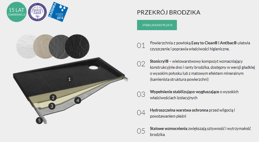 LIBRA BLACK STONE to subtelne brodziki charakteryzujące się niesamowitą w dotyku strukturą przypominającą do złudzenia kamień. Seria Libra oferuje minimalistyczny design w połączeniu z wygodą codziennego użytkowania. Brak klasycznych rantów przekłada się na niezwykle przestrzenną i czystą formę strefy kąpielowej, a odpowiednie spady konstrukcyjne zapewniają sprawny odpływ wody. Brodziki dają możliwość montażu „wpuszczanego”, dzięki czemu eliminują próg na wejściu do strefy prysznicowej. Seria LIBRA BLACK STONE posiada matową powierzchnię o strukturze, naturalnego kamienia w czarnym odcieniu (RAL 9004). Zaledwie 3 cm wysokości całkowitej oraz minimalistyczne wzornictwo efektownie akcentują strefę prysznica, zdobiąc wnętrze w nietuzinkowy sposób. Powierzchnia „Black Stone” jest niezwykle trwała, do tego posiada właściwości Easy to Clean® oraz Antibac®. Płytkość brodzików sprawia, iż pasują one doskonale do nowoczesnych wnętrz. Linia LIBRA BLACK STONE to kolejny członek ekskluzywnej rodziny SCHEDLINE COLLECTION, która wyróżnia się elegancją i dozą wyrachowanego stylu, który ciekawi i zachęca swoimi walorami :) Projektanci tworząc tą markę kierowali się elegancją połączoną z łatwością montażu i pełnym zadowoleniem użytkownika :) Prezentowana odsłona z odpływem usytuowanym w rogu to model reprezentujący grupę brodzików prostokątnych. Dzięki tak przemyślanemu miejscu na odpływ mamy dużą płaszczyznę brodzika, dzięki czemu jego użytkowanie jest bardzo wygodne. Brodziki LIBRA BLACK STONE zostały stworzone dla ludzi, którzy stawiają na jakość, styl i ekstrawagancję połączoną z dozą tajemniczości, nie boją się odważnych aranżacji i nowoczesnych rozwiązań, które można osiągnąć w tak prosty sposób jak zabawa kolorami :) Designerskie brodziki LIBRA BLACK STONE wykonano z wysokogatunkowego wielowarstwowego kompozytu Stonicryl® wzmacniającego konstrukcyjnie dno i ranty brodzika, dostępny w wersji gładkiej o wysokim połysku lub z matowym efektem mineralnym (kamienista struktura powierzchni). Co istotne - brodziki są bezpieczne dla zdrowia i środowiska, tj. wolne od FCKW, czyli nie zawierają freonów, które niszczą warstwę ozonową, a tym samym przyczyniają się do globalnego ocieplenia klimatu. Brodziki z podbudową STABILSOUND PLUS® wyróżnia nie tylko zintegrowana forma, ale również wysoka wytrzymałość brodzika na nacisk i na uszkodzenia mechaniczne :) Zastosowane technologie doskonale zabezpieczają powierzchnię przed uszkodzeniami mechanicznymi oraz mają zastosowanie wygłuszające i termoizolacyjne. Mroczny ale bardzo elegancki i ponadczasowy kolor czerni doskonale wkomponuje się w każdą aranżację i sprawi, że łazienka będzie zachwycająca, a wręcz zaskakująca :) Wprowadzony kolor czerni podkreśli jej pikantny charakter, a jednocześnie nada stylowości :) Wysokiej jakości kompozyt, z którego brodzik został wykonany jest bardzo trwały oraz doskonale przewodzi ciepło, co sprawia dodatkowe poczucie przyjemności podczas kąpieli pod prysznicem, gdyż powierzchnia brodzika jest ciepła co sprawia, że kontakt skóry stóp z powierzchnią brodzika jest naturalnym doznaniem :) Warto podkreślić, że ciekawa struktura kamienia sprawia, że powierzchnia nie będzie śliska co sprawi większe poczucie bezpieczeństwa :) Warto pokusić się na produkt, który jest efektowny wizualnie i komfortowy w użytkowaniu :) Takim produktem jest właśnie linia LIBRA BLACK STONE będącą częścią rodziny SCHEDLINE COLLECTION :)