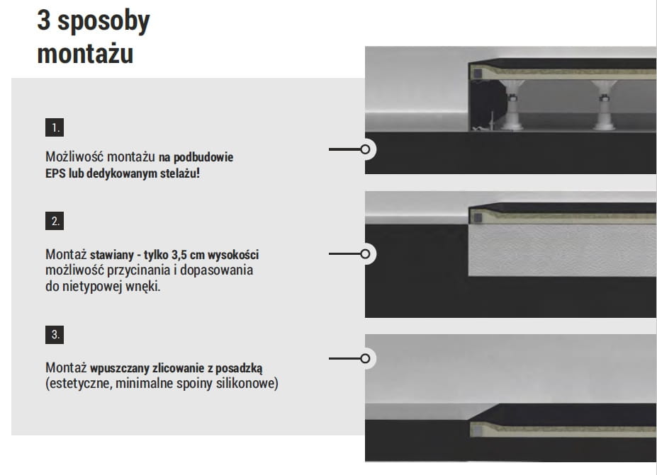 • możliwość montażu w płaszczyźnie podłogi lub na posadzce,