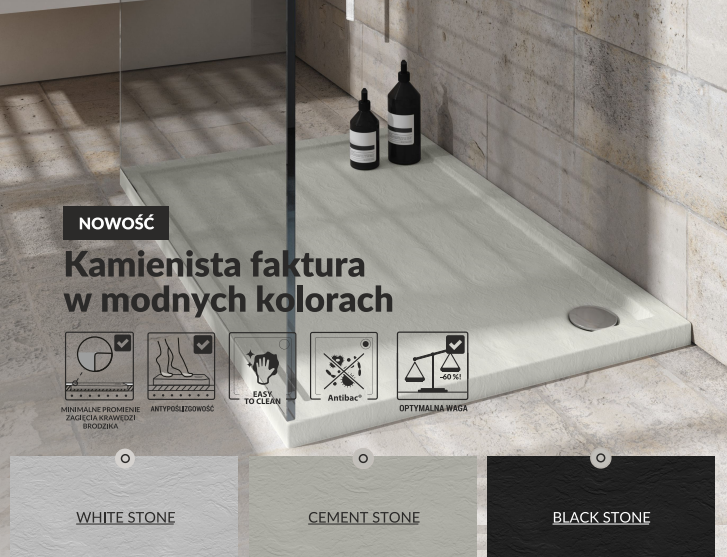 CASPAR NEW BLACK STONE to subtelna kolekcja, która opiera się o prostą, ale ponadczasową geometrię, która jest podstawą w projektach brodzików :) Seria CASPAR NEW BLACK STONE została stworzona dla ludzi ceniących nowoczesny styl w połączeniu z komfortem użytkowania. Niewielka wysokość całkowita sprawia, że te płytkie brodziki mogą zostać zamontowane na posadzce, lub też być w nią wpuszczone - oferując bezprogowy dostęp do strefy kąpielowej. Brodziki zostały wzmocnione laminatem żywicznym i płytą wiórową oraz pokryte innowacyjną powłoką antybakteryjną, ułatwiającą czyszczenie. Gwarantują długoletnie, komfortowe użytkowanie. Dzięki zastosowaniu dodatkowego wzmocnienia w postaci laminatu żywicznego, brodziki są bardziej wytrzymałe i bezpieczne w użytkowaniu :) Dodatkowym atutem jest specjalna powłoka antybakteryjna, dzięki której czyszczenie brodzika jest łatwiejsze, gdyż w mniejszym stopniu pozostają na jego powierzchni osady z kosmetyków pielęgnacyjnych:) Subtelny ale efektowny brodzik na pewno znajdzie miejsce w fajnej łazience :) dodatkowym atutem jest struktura kamienia w odcieni ponadczasowej, pięknej czerni o numerze RAL 9004 :) Warto podkreślić, że dzięki swojej strukturze kamienia brodziki z tej serii zapewniają ochronę przez poślizgnięciem i upadkiem (klasa „A” wg DIN 51097).