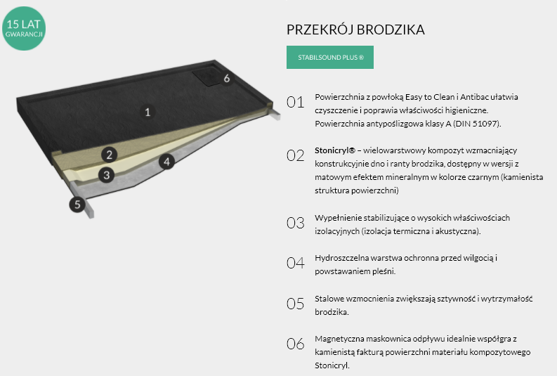 Seria Omega Black Stone to ciekawa odsłona brodzika, który w swoim designie przypomina kamień. Ponadczasowa czerń dodaje drapieżności i podkreśla sam kształt brodzika. Niby zwykły brodzik prostokątny, ale wyróżnia się ciekawą strukturą i inspirującym materiałem wykonania oraz mistycznym kolorem czerni, która jest dozą ekstrawagancji. Kolejną zaletą tego brodzika jest możliwość swobodnego montażu na posadzce lub w jednym poziomie z podłogą łazienki. Designerska, magnetyczna maskownica odpływu została umieszczona przy środkowej części dłuższego boku, dzięki czemu cała konstrukcja jest wizualnie spójna. Jak nazwa serii wskazuje, brodziki wyróżnia matowa powierzchnia o strukturze naturalnego kamienia w czarnym odcieniu, co jest niesamowicie inspirującym bodźcem aranżacyjnym. Powierzchnia „Black Stone” jest także niezwykle trwała, a do tego posiada powłokę Easy to Clean® oraz Antibac®, dzięki której czyszczenie powierzchni brodzika jest o wiele łatwiejsze, co za tym idzie technologia ta niesie ze sobą wiele korzyści użytkowych. Kolejnym ważnym atrybutem tego niesamowitego brodzika jest materiał z którego ten brodzik jest wykonany Stonicryl®. Jest to wielowarstwowy kompozyt wzmacniający konstrukcyjnie dno i ranty brodzika, dostępny w wersji z matowym efektem mineralnym w kolorze czarnym podkreślającym kamienistą strukturę powierzchni. Wysokiej jakości wypełnienie stabilizujące o wysokich właściwościach izolacyjnych daje doskonałą izolację termiczną i akustyczną. Brodzik lepiej utrzymuje temperaturą i kąpiel nie jest głośna :) Dzięki takim właściwościom i ciszy możemy się odprężyć i odpocząć pod strumieniami ciepłej wody :) Zwykły brodzik, a tyle zalet więc dlaczego sobie nie pozwolić na zakup :), a dodatkowo możemy cieszyć aż 15-to letnią gwarancją :) Same zalety wizualne idące w parze z funkcjonalnością :)