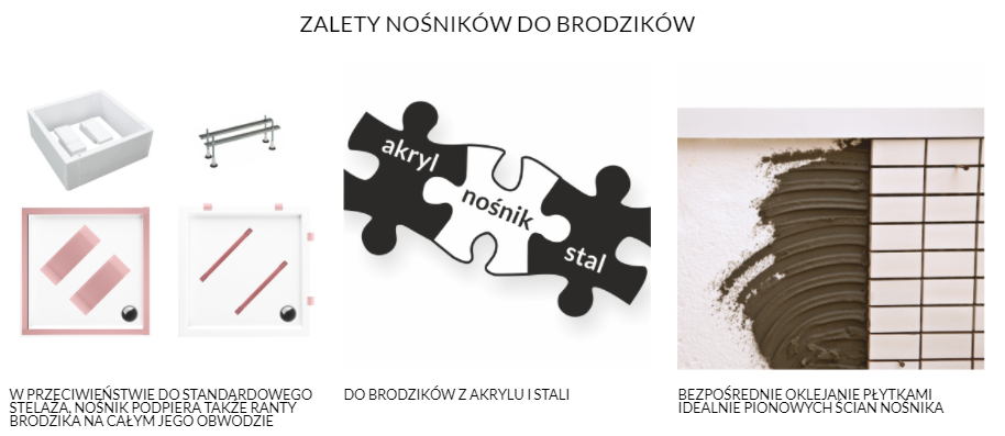 Osadzenie brodzika na nośniku Stabilsound ® umożliwia bezproblemowe obudowanie glazurą, dzięki gotowej powierzchni do oklejania. Montaż na nośniku oznacza również najstabilniejsze posadowienie - równomierne podparcie całej powierzchni brodzika, w przeciwieństwie do montażu na metalowym stelażu, brodzik podparty jest także na całym swoim obwodzie – rantach. Nośnik niesie ze sobą wiele korzyści wynikających z użytkowania, takich jak izolacja akustyczna, termiczna, czy wieloletnia wytrzymałość, ale najważniejszą jest jednak bezproblemowy i bezpieczny montaż :) podsumowując same plusy :) a żadnych minusów :) podsumowując FAJNY PRODUKT i fajne bezproblemowe rozwiązanie :)