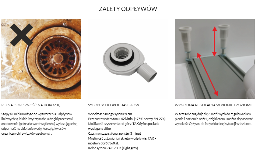 Odpływ liniowy BASE-LOW maskownicą STEEL to jedna z wielu propozycji odpływów posadzkowych marki SCHEDPOL stosowanych w strefach prysznicowych, których zastosowanie przyczynia się do stworzenia niebanalnej, minimalistycznej i komfortowej aranżacji w każdej łazience. Zachowanie idealnych parametrów związanych z odpływem wody, a także łatwość czyszczenia oferowanych odpływów liniowych to bardzo ważne dla użytkowników kwestie, na które firma Schedpol podczas produkcji zwróciła szczególną uwagę. Zastosowanie unikalnych technologii gwarantuje zachowanie pełnej szczelności odpływu liniowego. Stopy aluminium użyte do wytworzenia Odpływów liniowych są lekkie i wytrzymałe, a dzięki procesowi anodowania (pokrycia warstwą tlenku) wykazują odporność na działanie wody, korozję, licznych kwasów organicznych i związków azotowych. Dzięki precyzyjnie dopracowanym technologiom nie musisz się obawiać przeciekania czy pojawienia nieestetycznych plam rdzy na odpływie oraz maskownicy odpływu liniowego – produkt jest w 100% odporny na działanie wody oraz korozję. Oferowany w zestawie markowy syfon to jeden z najlepszych produktów tego typu na rynku, charakteryzuje się świetnymi parametrami w zakresie odpływu wody z prysznica. Syfon Schedpol Base-Low to generacja najwyższej jakości polskich odpływów adresowanych do nabywców bardzo niskich brodzików z otworem Ø 50 mm. Syfon o konstrukcji wirowej jest obecnie gamą najniższych syfonów na rynku, które osiągają przepływ nawet 42 l/ min. Lekkie i wytrzymałe odpływy liniowe pozwalają na stworzenie strefy prysznicowej bez instalowania standardowego brodzika. Coraz częściej właściciele mieszkań czy domów montują nowoczesne odpływy liniowe w swoich łazienkach. Dla producentów, poza właściwościami technicznymi coraz częściej bardzo ważna staje się estetyka samego produktu, gdyż większość renomowanych odpływów liniowych wyposażona jest w eleganckie maskownice, które pięknie wyglądają we wnętrzu każdej łazienki, niezależenie od stylu, w jakim została ona urządzona. Odpływ liniowy sprzedawany jest w komplecie z nowoczesnymi i wydajnymi syfonami, umożliwiającymi efektywny odpływ wody spod prysznica. Dzięki temu nie ryzykujemy zalania łazienki :) a cały zestaw odpływu wody pracuje wydajnie bez żadnych problemów. Aby zainstalować odpływ liniowy wody wystarczy wkuć się w powierzchnię podłogi lub stropu :) Warto podkreślić, że do produkcji odpływów producent wykorzystuje wyłącznie certyfikowane materiały, które są gwarancją jakości i bezpiecznego użytkowania:)