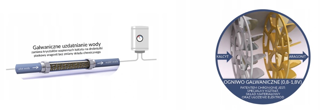 Woda przepływająca przez IPS tworzy za pomocą elektrod mokre ogniwo galwaniczne o napięciu do 4,2 - 6 V. Efektem tego minerały i sole zawarte w wodzie tracą zdolność do tworzenia osadów krystalicznych (kalcytów), nabierając struktury miękkich cząstek (aragonit) i są wypłukiwane wodą. Taka struktura jest utrzymywana do 72 godzin.