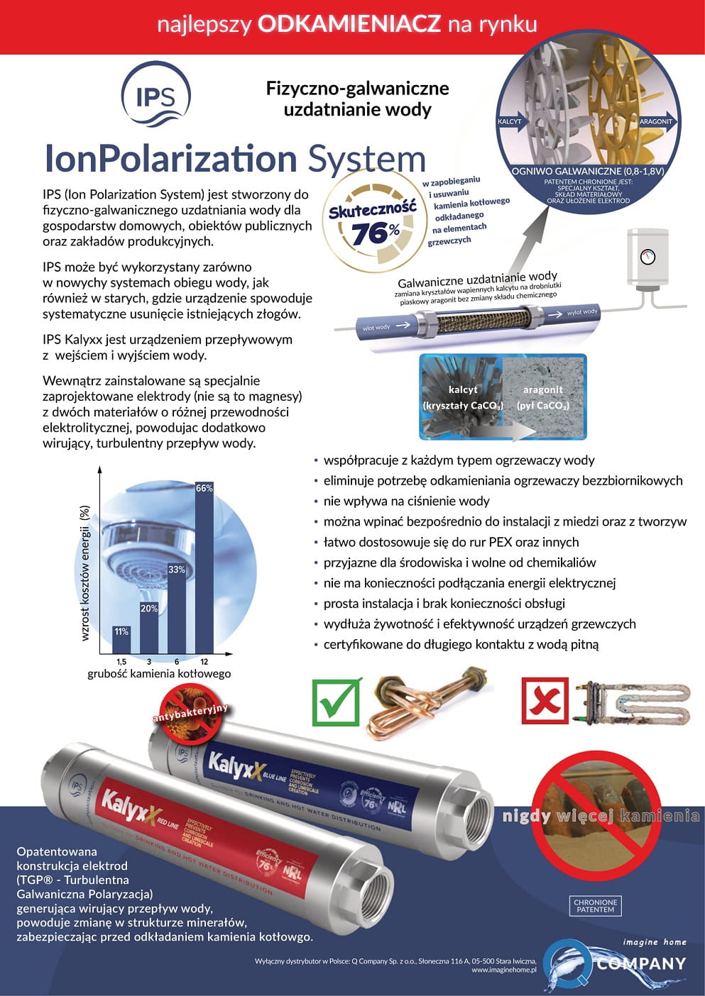 IPS KаlухX (lon Polarization System) jest zaprojektowany do fizyczno-galwanicznego uzdatniania wody w gospodarstwach domowych, obiektach publicznych, restauracjach, hotelach, zakładach produkcyjnych i usługowych. IPS niezawodnie działa przy stosowaniu przed wymienikami ciepła, zarówno w systemach grzewczych, jak i chłodniczych (np. klimatyzacje). Poprzez twardość wody rozumiemy ilość wapnia i magnezu zawartego w wodzie.