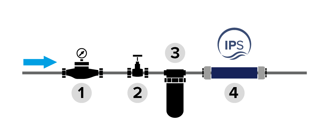 Przed urządzeniem IPS rekomendujemy montaż mechanicznego filtra z wkładem zabezpieczającym przed drobinami minimum 50 mikronów.