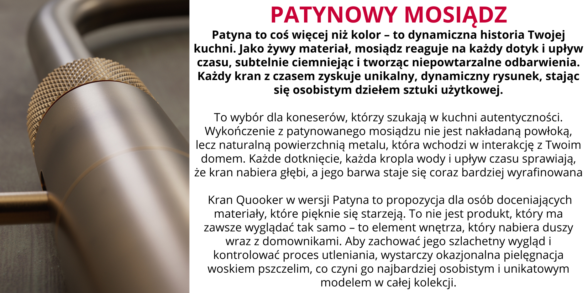 2. WAŻNE: Patyna to wykończenie, które reaguje z otoczeniem. Ślady palców czy kropel wody są naturalnym procesem utleniania i nadają kranowi „duszy”.