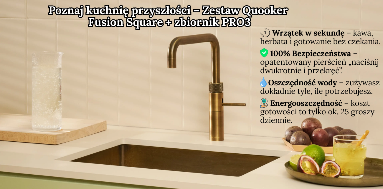 Wszystko zaczęło się w 1970 roku w Rotterdamie. Henri Peteri, pracujący wtedy nad zupami błyskawicznymi, doznał olśnienia: po co czekać na wodę, skoro można ją mieć gotową zawsze? Tak narodził się pierwszy na świecie kran wrzący. Quooker to firma rodzinna, która od ponad 50 lat udoskonala jedną, genialną ideę. Wybierając model Fusion Square, nie kupujesz tylko baterii – kupujesz dziedzictwo inżynierii, która zmieniła oblicze nowoczesnej kuchni na całym świecie. To oryginał, którego nikt nie zdołał doścignąć.