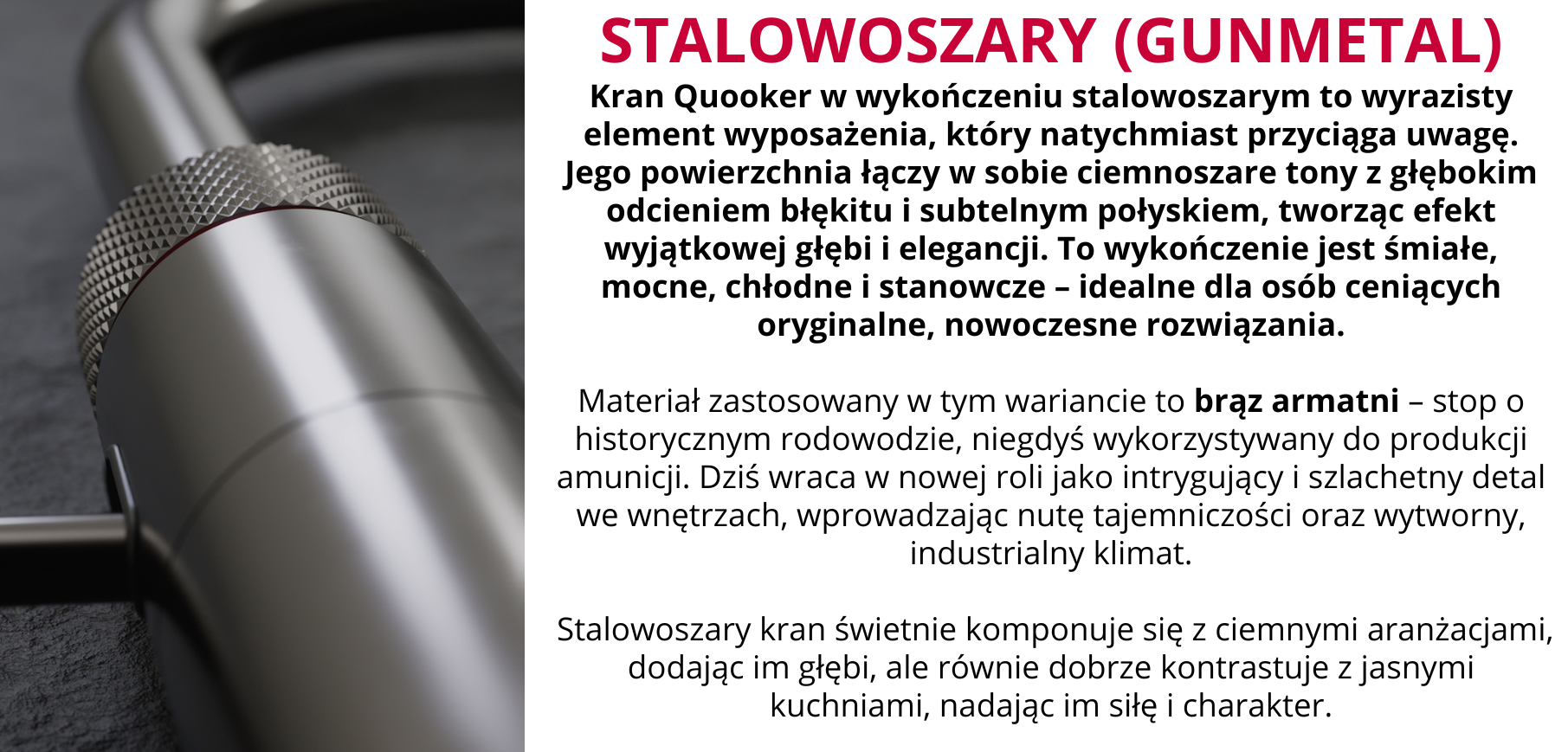 - aby uniknąć zacieków z wody i utrzymać głębię koloru Gunmetal, warto delikatnie wytrzeć kran do sucha.